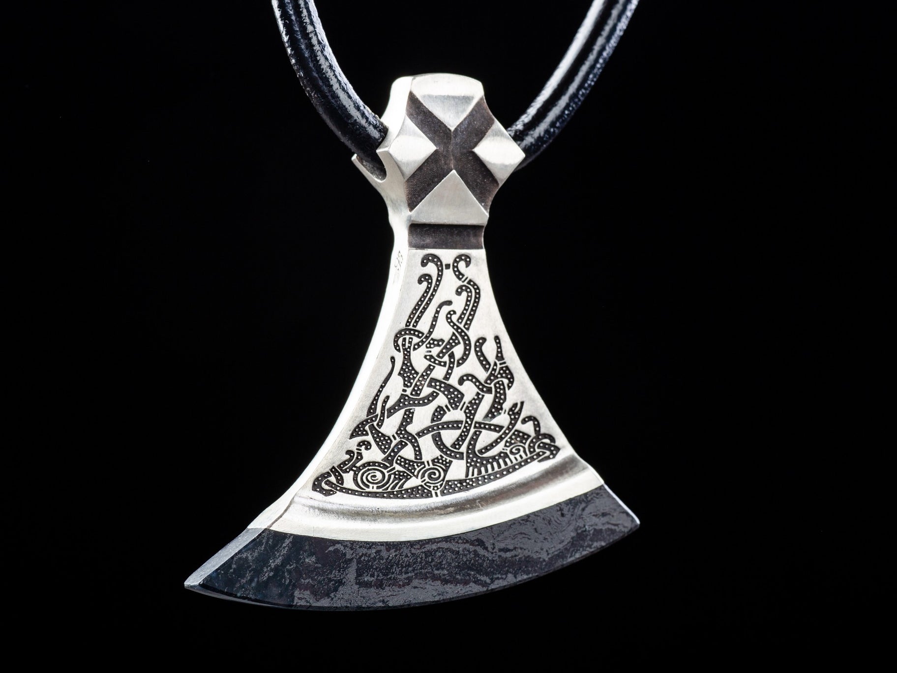 Our Mammen Axe Necklace Collection showcases an exquisite replica of the renowned Mammen Axehead, a Viking masterpiece dating back to 970 CE, discovered in Jutland, Denmark. Meticulously crafted, the axe pendant is adorned with captivating Mammen-style decorations on both sides, complemented by a diligently hand-carved stone blade, adding a unique touch of distinction. Its remarkable blend of historical significance and artistic craftsmanship makes this pendant a truly exceptional piece.