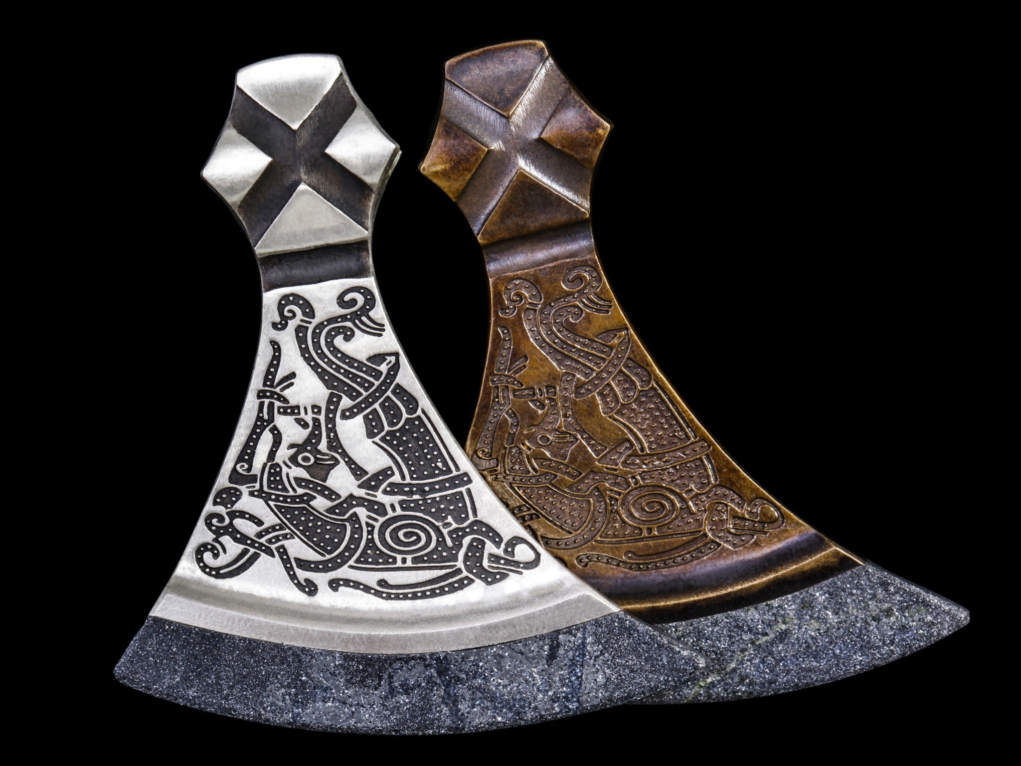 Replica of the renowned Mammen Axehead, an intricately designed Viking artwork originating from the year 970 CE and discovered in Jutland, Denmark.