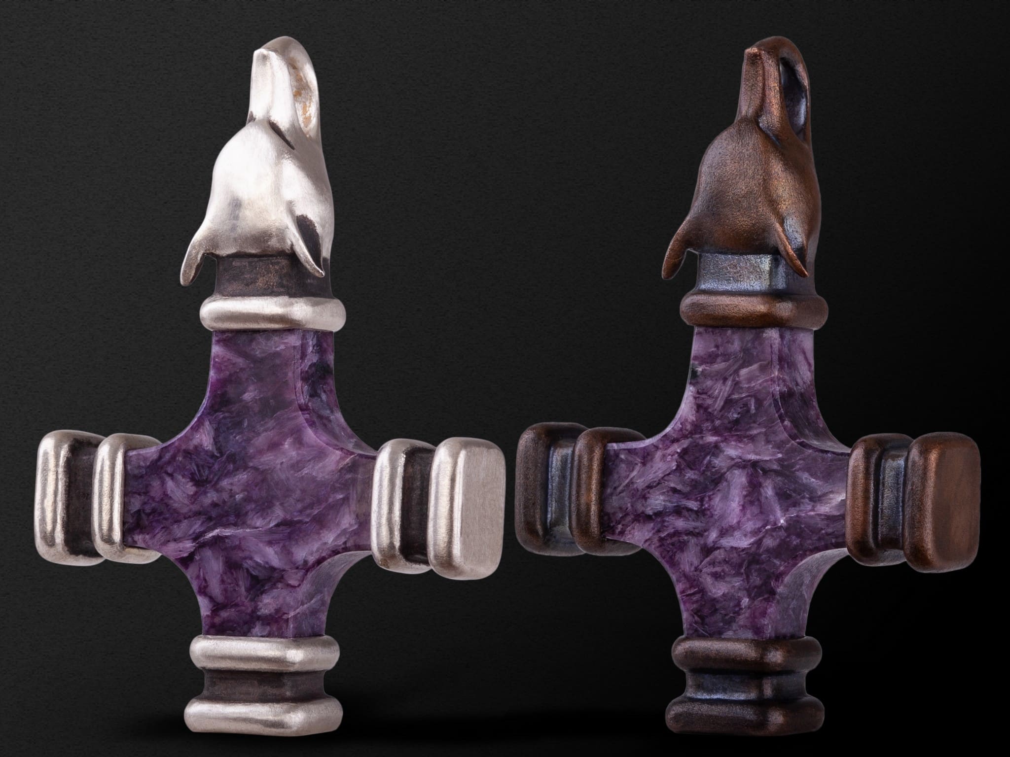 Replica and artistic interpretation of The Wolf Cross, an intriguing 10th-11th century silver amulet discovered in Foss, Iceland.